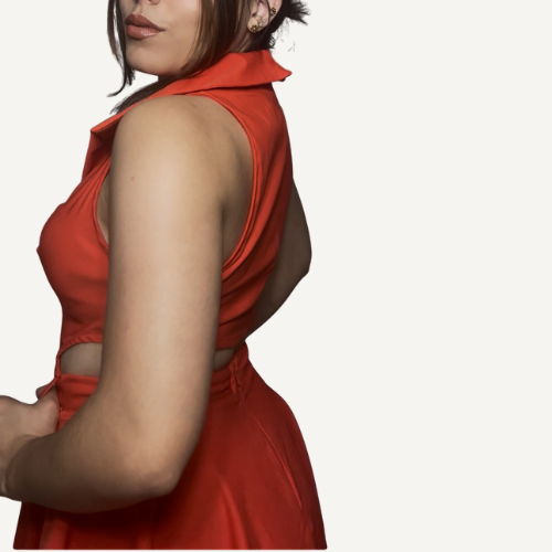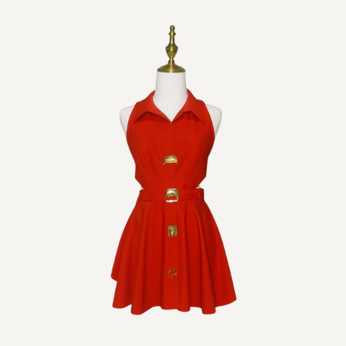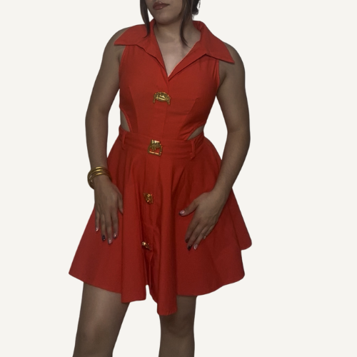 Este diseño sin mangas en rojo vibrante combina un escote halter con cuello estructurado y tres broches dorados que acentúan la silueta con carácter. El corte abierto en la cintura que se extiende hasta la espalda añade un toque inesperado y seductor, revelando justo lo necesario para destacar con elegancia. Ideal para noches especiales, eventos glam o sesiones fotográficas donde el estilo lo es todo.